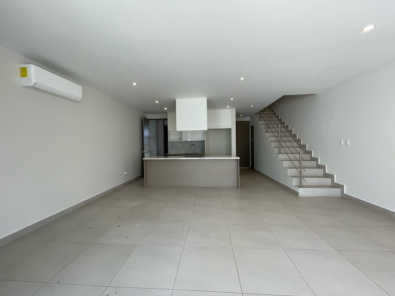 - cocina de concepto abierto con sobres de cuarzo y muebles
